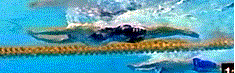 Frame #6: The arm pull positions are very similar to those of a good butterfly pull. The forearms are angled, rather than vertical, so that an exaggerated torso and head lift can be achieved. A brief but powerful thrust is created. A major criticism of Fioravanti's stroke is his head and shoulders lift too high out of the water, which result in later stroke compromises. The lifting movements are achieved by hyperextending the back, which allows the hips and legs to trail in a streamlined position.