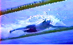 Frame #3: The right arm initiates the exit by extending backward and rounding upward. The left leg performs an abbreviated kick to partially counterbalance vertical forces created by the exiting right arm. The remaining counterbalancing force comes from the left arm beginning to press downward. This frame illustrates Hackett's superb streamline, a feature that has always marked his crawl stroke swimming. The head is turned to the right.