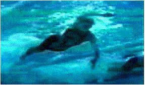 Frame #3: Left arm propulsion is nearing its end. The swimmer's streamline is demonstrated clearly in this picture. There is a straight line from the left knee to the shoulders. The right arm begins to press down with slight flexion at the wrist and elbow. Much of the press results from rotating the right shoulder downward as part of the swimmer's good use of body roll. The left leg approaches the end of its kick.