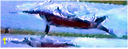 Frame #2: The left arm remains "parked" in front of the swimmer. The right arm propulsion has been backward but considerable sliding upward has reduced its potential for optimal effectiveness. An emphasis on the "back-end" of the pull could increase propelling efficiency of the right arm's latter phase. As the head lifts and turns to the right and the right arm slides upward, the left knee drops and flexes preparatory to producing a short quick kick to counter-balance their mainly vertical forces.