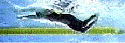 Frame #6: The arms bend at the elbows, only slight medial rotation of the upper arms occurs, some abduction of the upper arms develops force, but most of the force developed is vertical causing the head and shoulders to rise and the hips to sink further. [The large amount of water that is moved by vertical hip and leg movements requires energy, and that is energy that could be used for propulsion.]